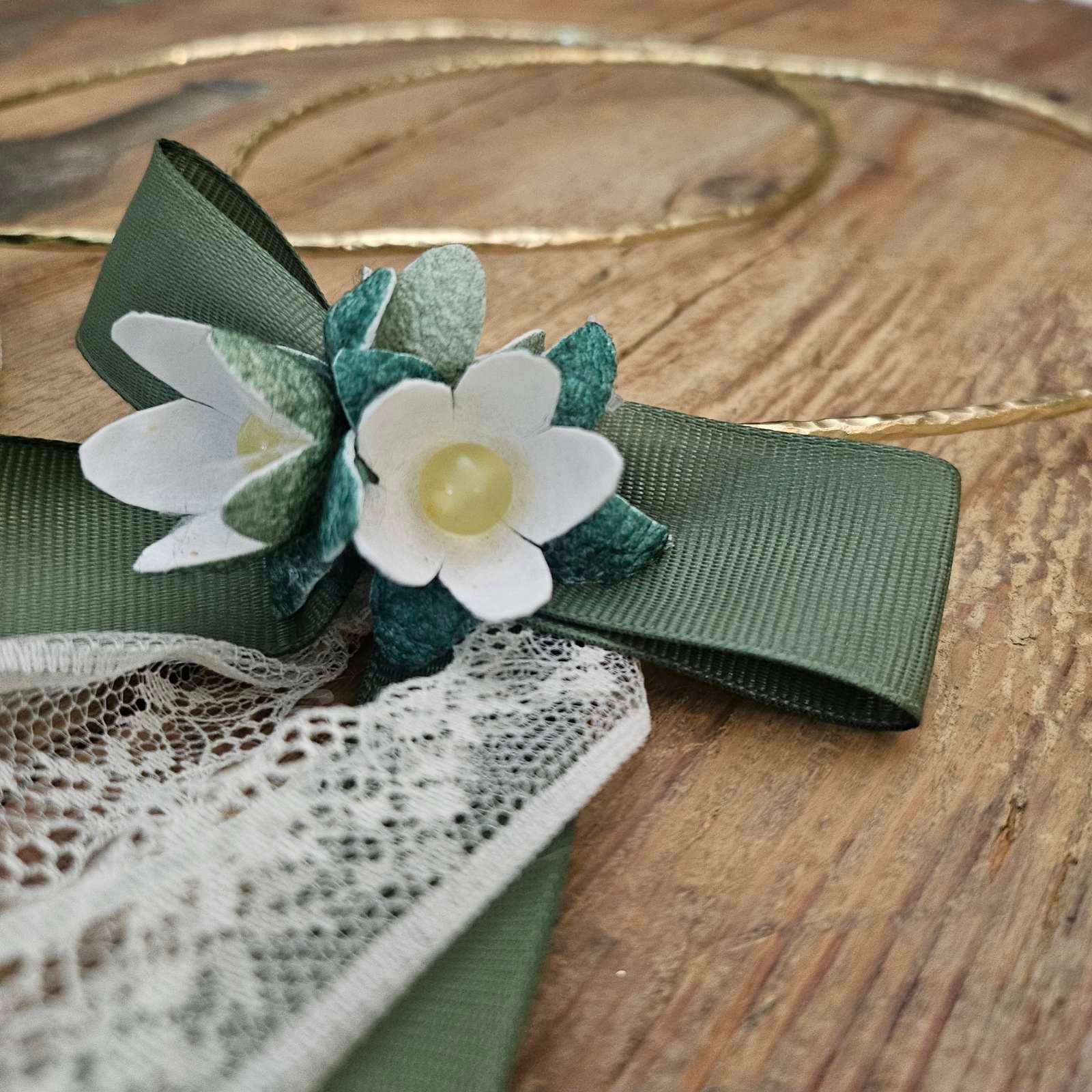 Επίχρυσα σφυρήλατα στέφανα, δεμένα στο πίσω μέρος με λαδί γκρο κορδέλα, ιβουάρ δαντέλες, διακοσμημένα με πράσινα φυσικά λουλούδια από το κουκούλι του μεταξοσκώληκα και ημιπολύτιμες πέτρες κίτρινου αχάτη.