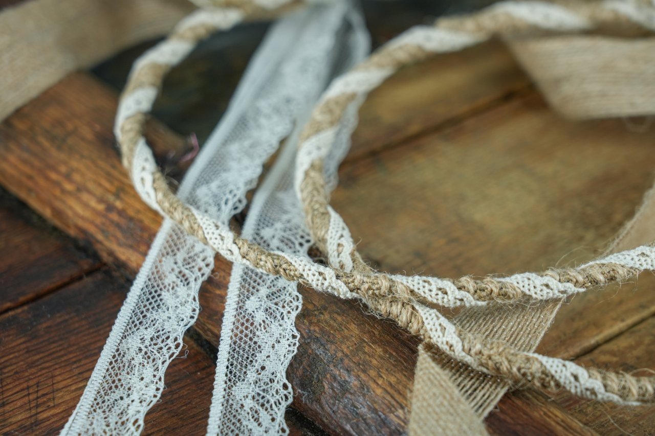 Στέφανα γάμου πλεγμένα με λινάτσα και δαντέλα, ιβουάρ κορδέλες και φυσικά λουλούδια από το κουκούλι του μεταξοσκώληκα, με ιβουάρ πέρλες