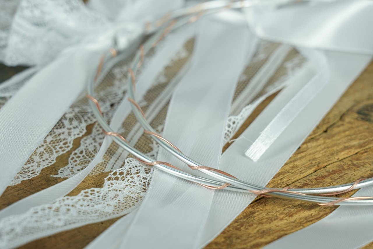 Επάργυρα στέφανα γάμου, πλεγμένα με σφυρήλατη λεπτή βέργα σε ροζ-χρυσό, δεμένα με λευκές δαντέλες και κορδέλες, διακοσμημένα με στρας τύπου swarovski.