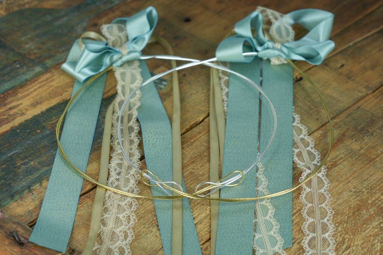 Στέφανα γάμου με δύο διπλές βέργες, επίχρυση και επάργυρη, πλεγμένες μεταξύ τους , σχηματίζουν το άπειρο, δεμένα με κορδέλες σε αποχρώσεις μέντας, χρυσού και μπεζ