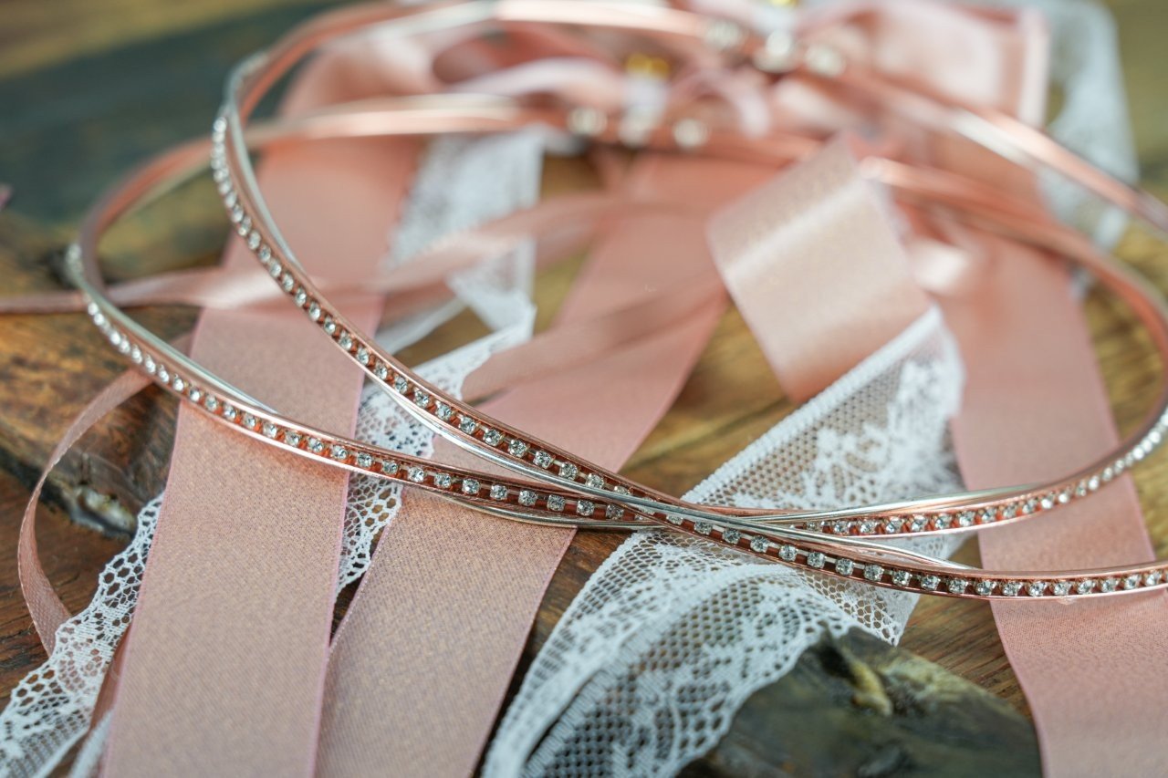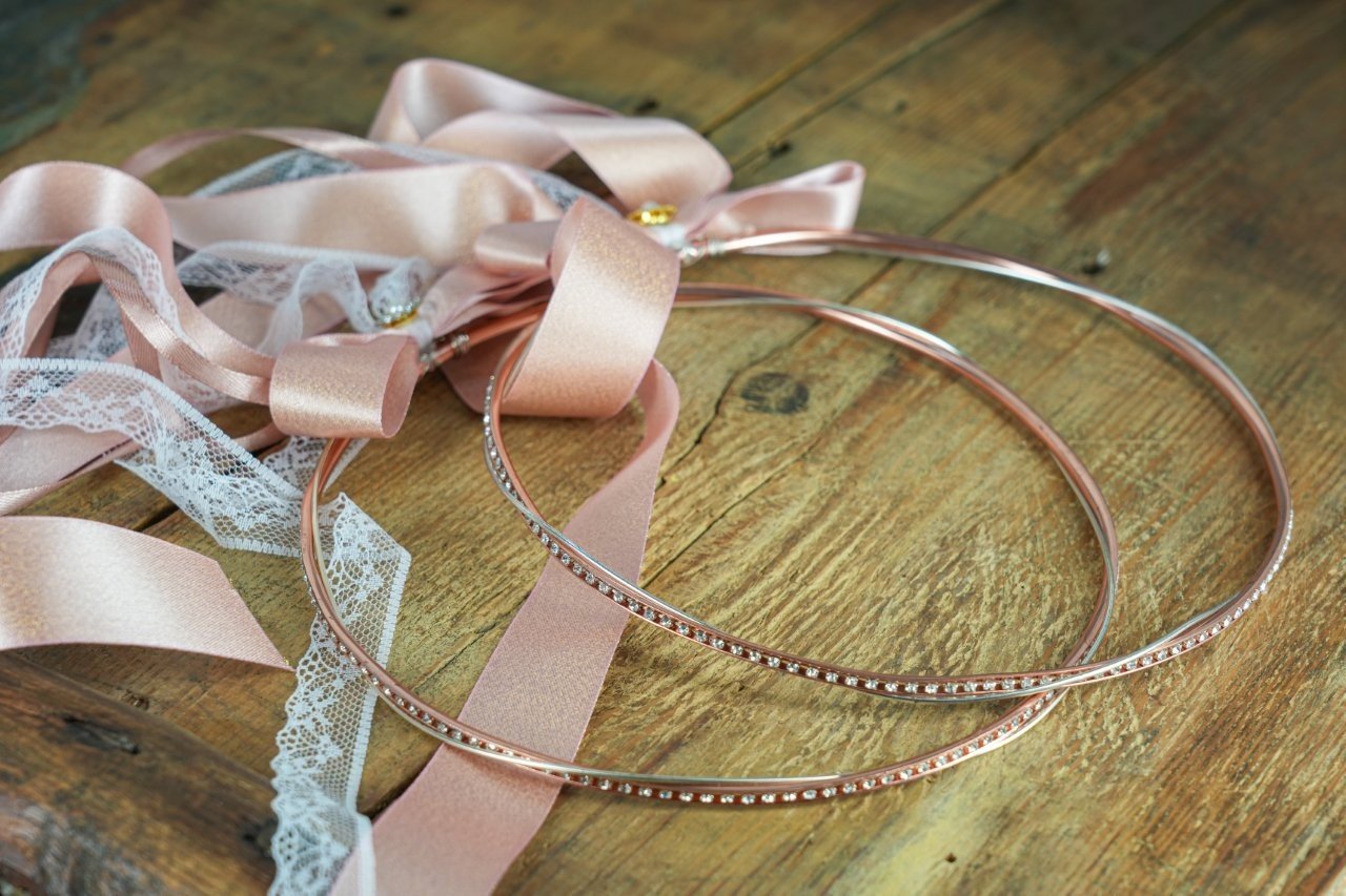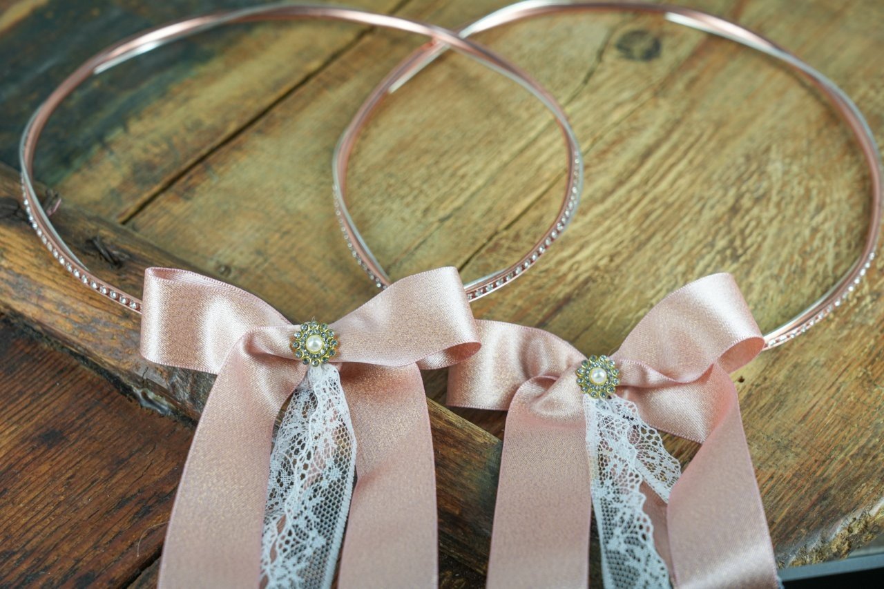 Ροζ Χρυσά Στέφανα με Φιόγκο & Δαντελένια Κορδέλα