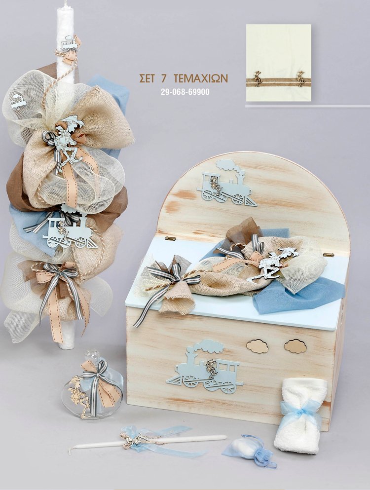 Ζήστε τη μαγεία μιας θεματικής βάπτισης με το βαπτιστικό πακέτο αγοριού “Άγρια Δύση – Τρενάκι”. Σε αποχρώσεις μπεζ, καφέ και γαλάζιου, το σετ ξεχωρίζει για τις ξύλινες φιγούρες με καουμπόη και τρενάκι, που δίνουν παιχνιδιάρικο αλλά και εντυπωσιακό χαρακτήρα.