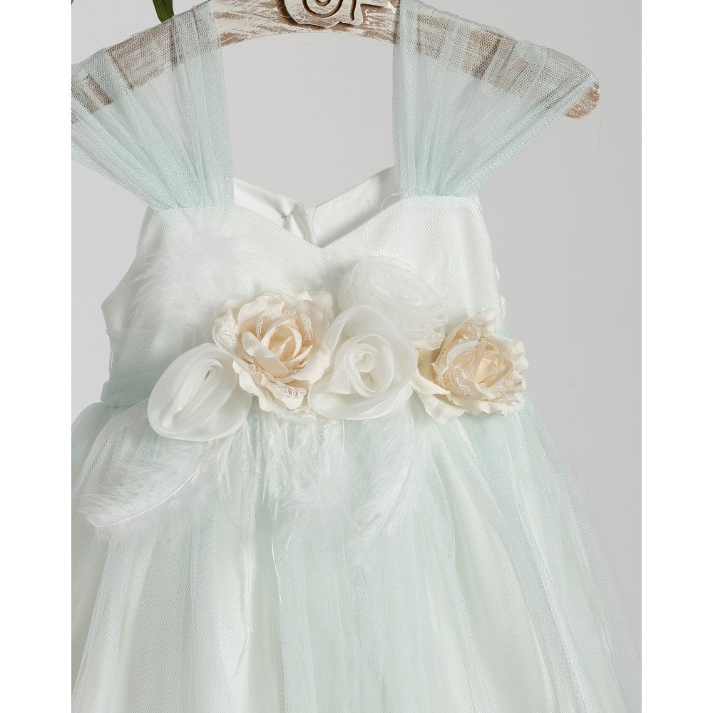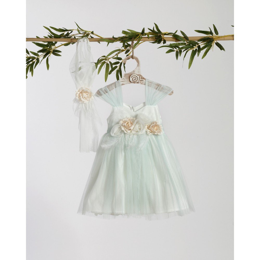 Ρομαντικό φόρεμα βάπτισης σε απαλό παστέλ με τούλι και χειροποίητα λουλούδια σε εκρού αποχρώσεις. Συνοδεύεται από ασορτί μαντήλι.