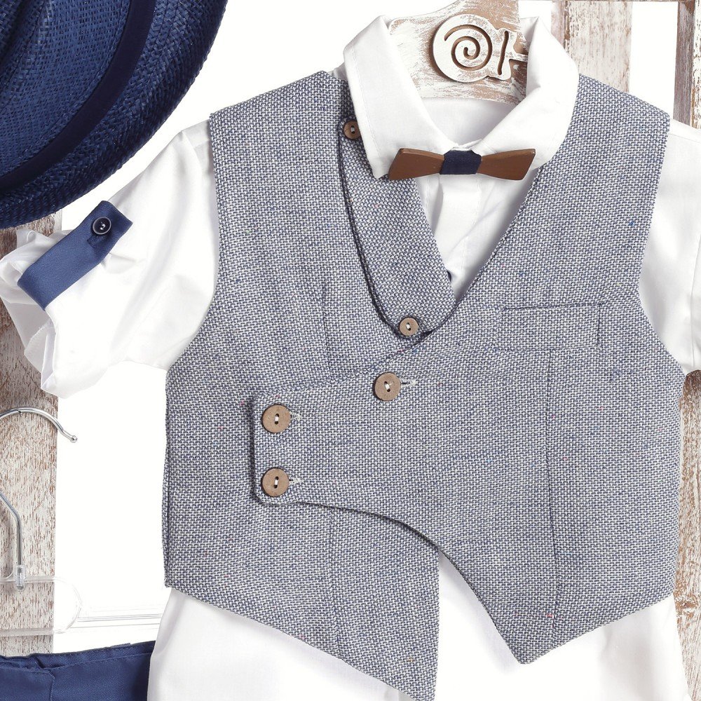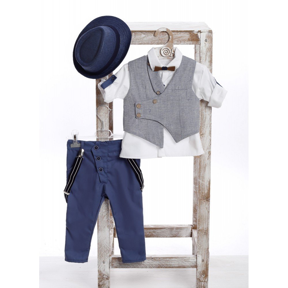 Το λευκό πουκάμισο δένει αρμονικά με το γκρι γιλέκο και το μπλε παντελόνι, ενώ οι τιράντες και το παπιγιόν προσθέτουν μια κομψή αλλά και παιχνιδιάρικη πινελιά. Το καπέλο ολοκληρώνει το outfit, δίνοντας στο παιδί τον αέρα ενός μικρού κυρίου.
