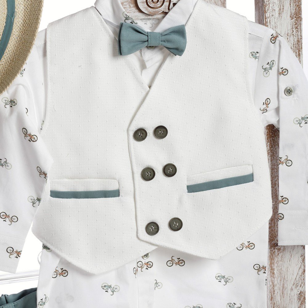 Κομψό σετ βάπτισης για αγόρι με πουκάμισο σε print ποδήλατα, λευκό γιλέκο με λεπτομέρειες, παπιγιόν, παντελόνι σε mint απόχρωση με τιράντες και ψάθινο καπέλο. Ιδανικό για μια ξεχωριστή εμφάνιση με στυλ και άνεση