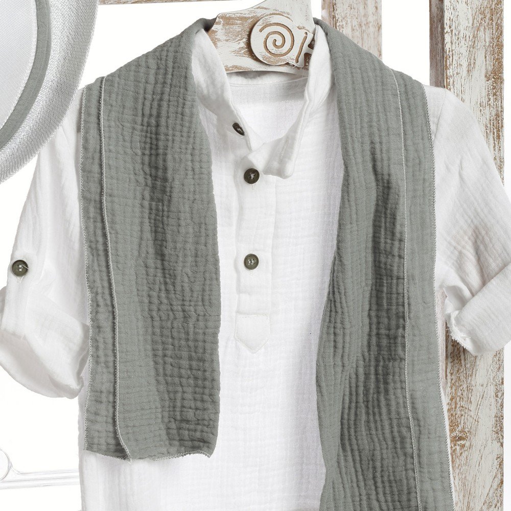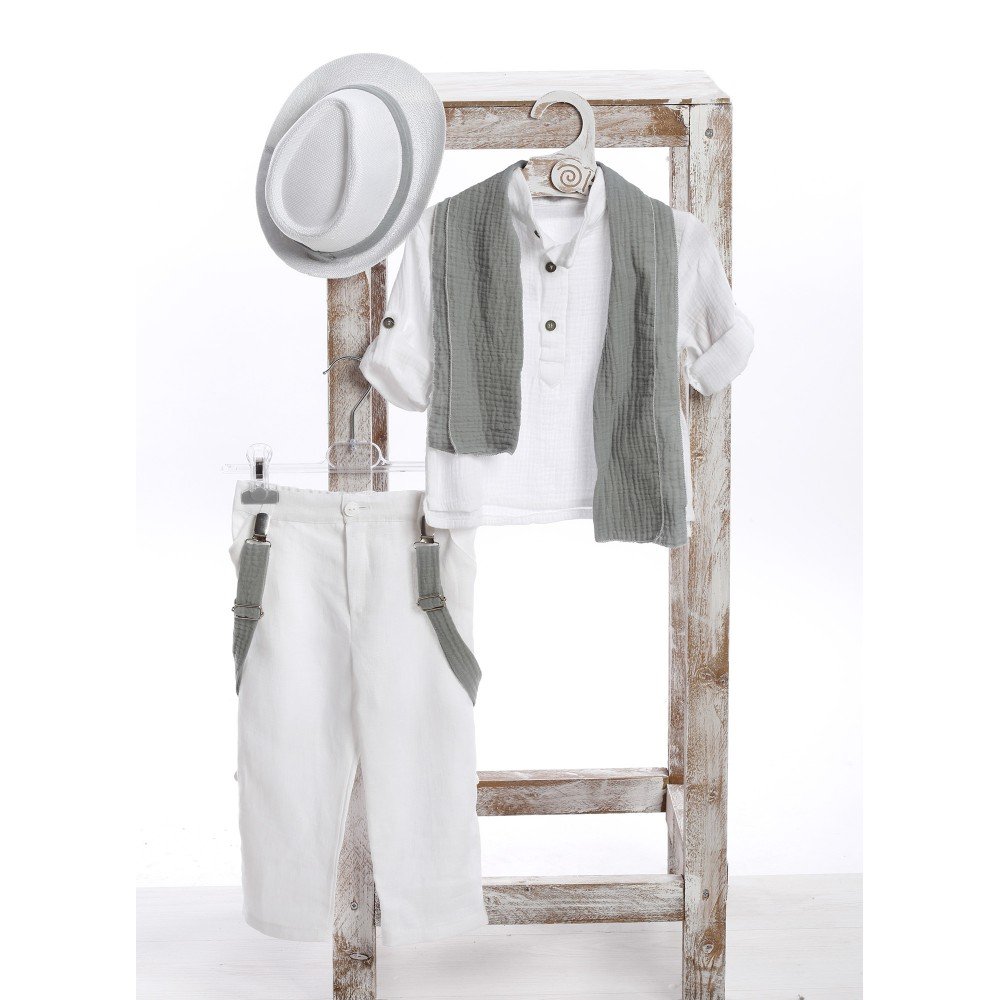 Ένα δροσερό και στυλάτο βαπτιστικό σύνολο σε γήινες αποχρώσεις. Αποτελείται από λευκό πουκάμισο με κοντό μανίκι και διακριτικά κουμπιά, λευκό παντελόνι με τιράντες σε γκρι απόχρωση και ασορτί φουλάρι. Το λευκό καπέλο με γκρι κορδέλα ολοκληρώνει την εμφάνιση, χαρίζοντας μια casual chic πινελιά, ιδανική για καλοκαιρινή βάπτιση.