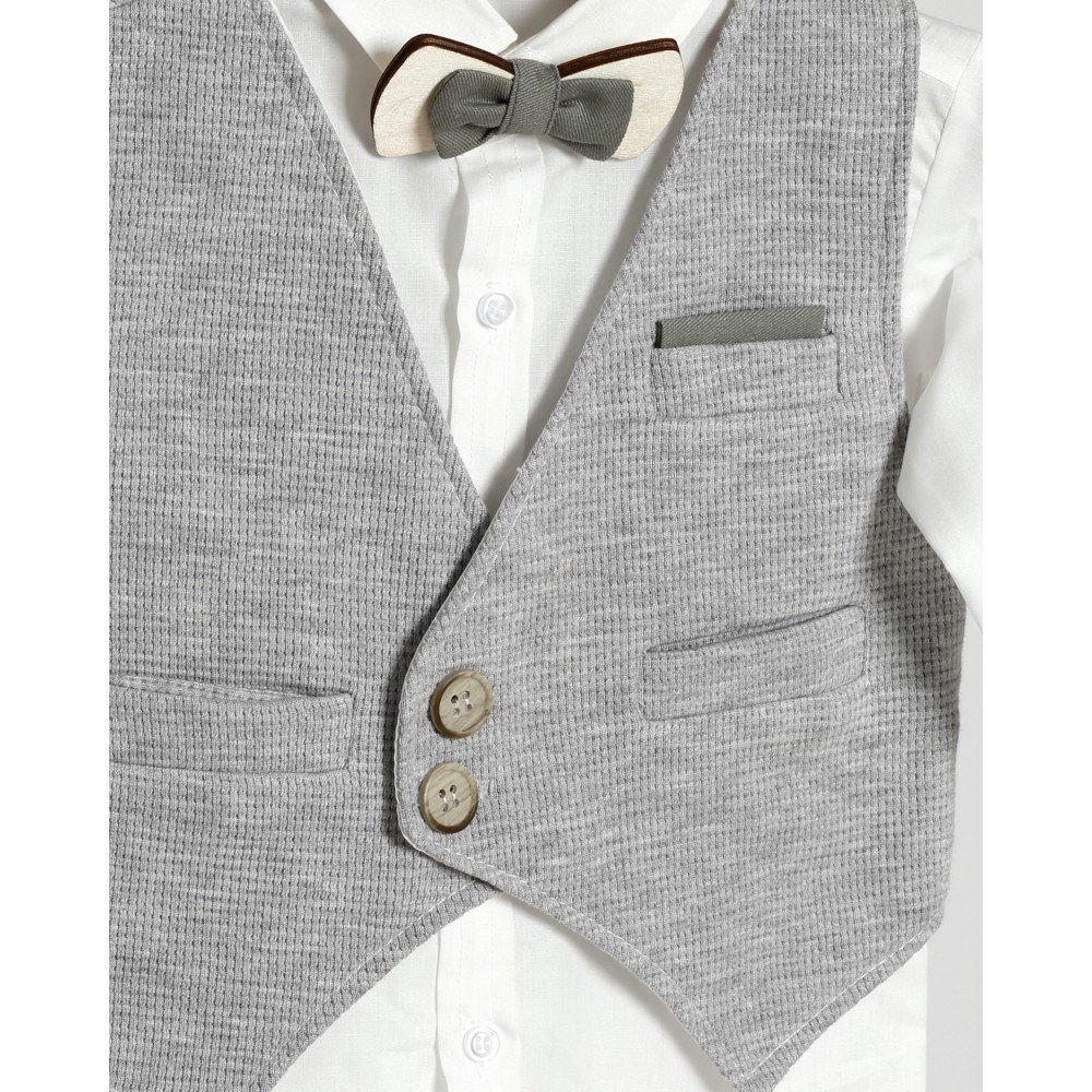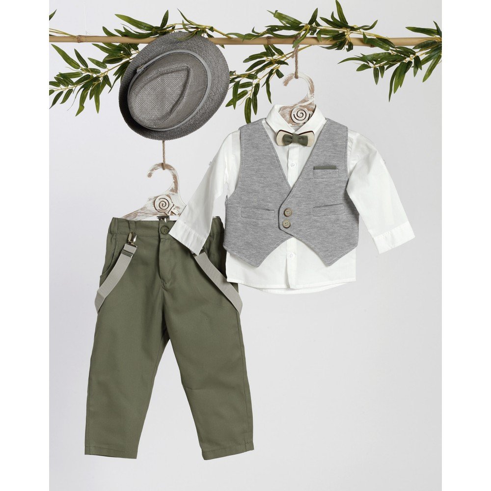Κομψό βαπτιστικό σετ για αγόρι σε γκρι και λαδί αποχρώσεις. Αποτελείται από λευκό πουκάμισο, γκρι γιλέκο με τσέπη και κουμπιά, λαδί παντελόνι με τιράντες και παπιγιόν για επιπλέον στυλ. Το σύνολο ολοκληρώνεται με γκρι καπέλο, δημιουργώντας μια μοντέρνα αλλά και διαχρονική εμφάνιση, ιδανική για ξεχωριστές περιστάσεις.