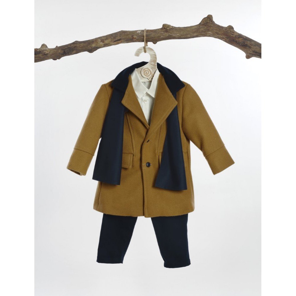 Εντυπωσιακό και σικάτο βαπτιστικό σετ για αγόρι, που συνδυάζει κλασική κομψότητα με μοντέρνο χαρακτήρα. Το σύνολο περιλαμβάνει εκρού πουκάμισο, μπλε παντελόνι και υπέροχο καμηλό παλτό με σκούρο μπλε κασκόλ, δημιουργώντας έναν ακαταμάχητο χειμερινό συνδυασμό. Μια εμφάνιση που αποπνέει ζεστασιά, στυλ και ξεχωριστή φινέτσα για τον μικρό σας πρίγκιπα.