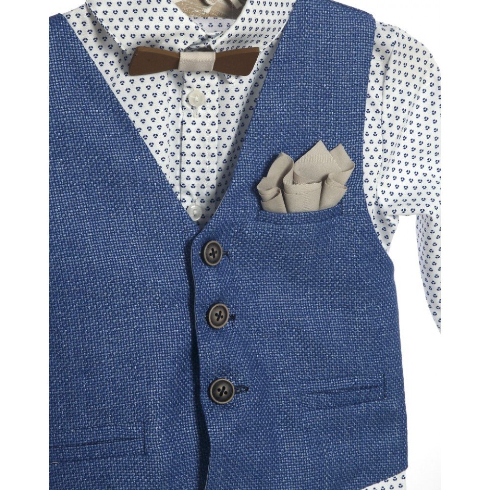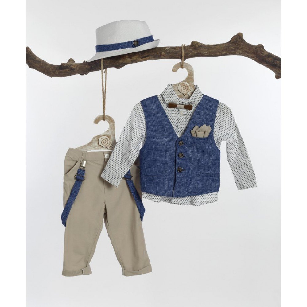 Κοομψό και μοντέρνο βαπτιστικό σετ για αγόρια, που συνδυάζει φινέτσα και παιχνιδιάρικη διάθεση. Περιλαμβάνει μπεζ παντελόνι με τιράντες, πουκάμισο με μικρό μοτίβο και μπλε γιλέκο με διακοσμητικό μαντηλάκι.