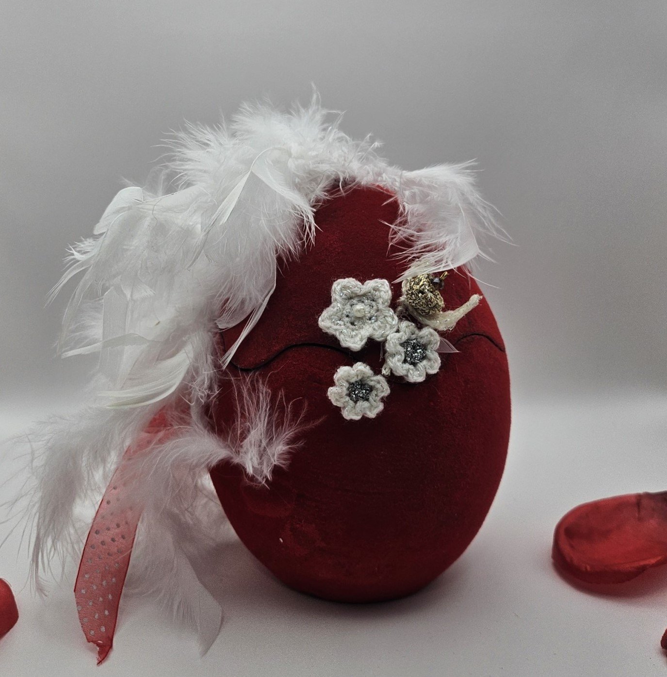 Χειροποίητο πορσελάνινο διακοσμητικό αυγό επενδυμένο με κόκκινο βελούδο, διακοσμημένο με φτερά και λεπτομέρειες λουλουδιών, που χαρίζει ζεστή και κομψή πασχαλινή ατμόσφαιρα στον χώρο σας.
