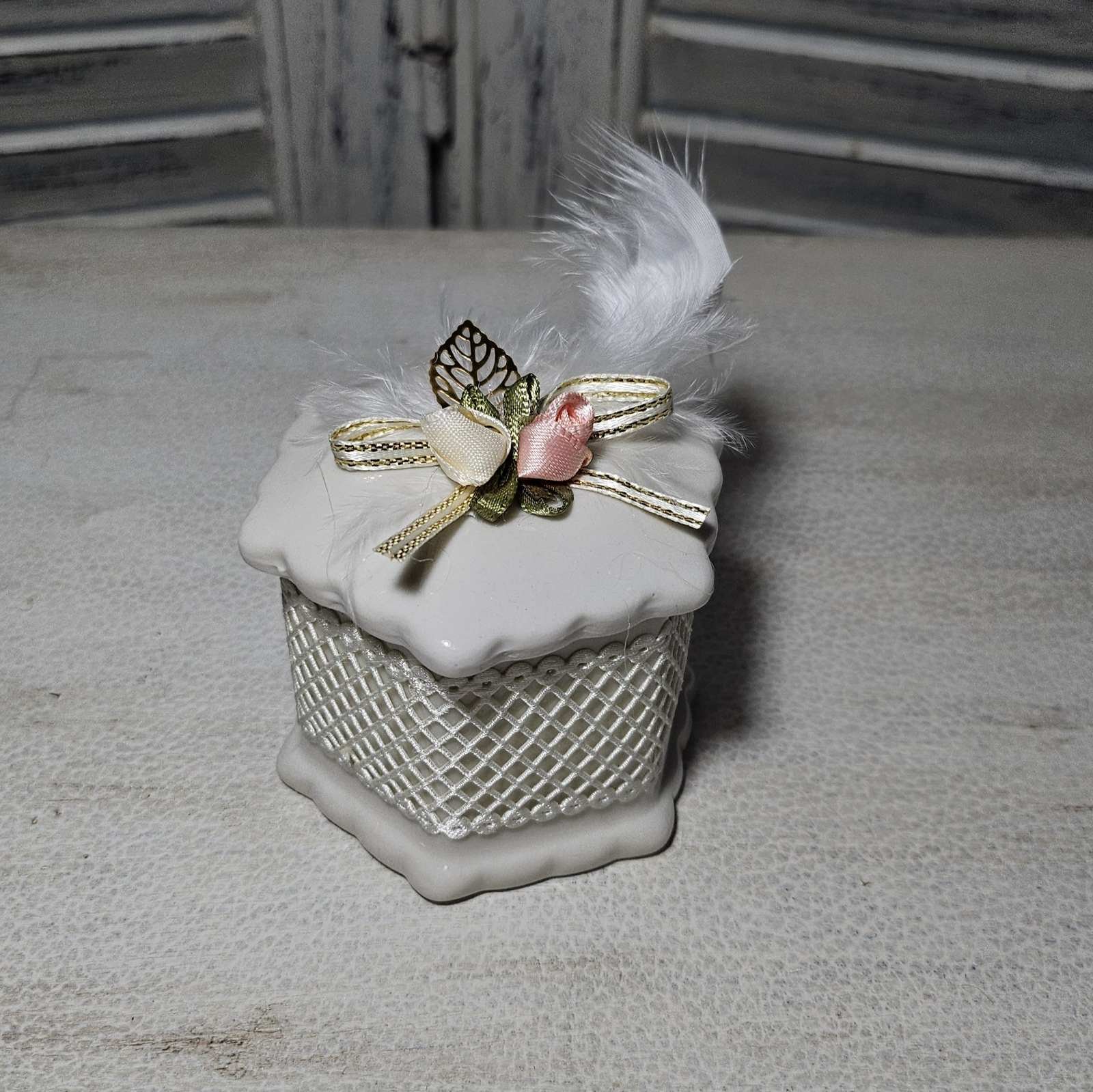 Πορσελάνινη βεροθήκη με ανάγλυφο σχέδιο, καπάκι στολισμένο με σατέν λουλούδια, χρυσή κορδέλα και λευκό φτερό. Μια πολυτελής και ρομαντική δημιουργία για την κομψή παρουσίαση και φύλαξη των βερών του γάμου.