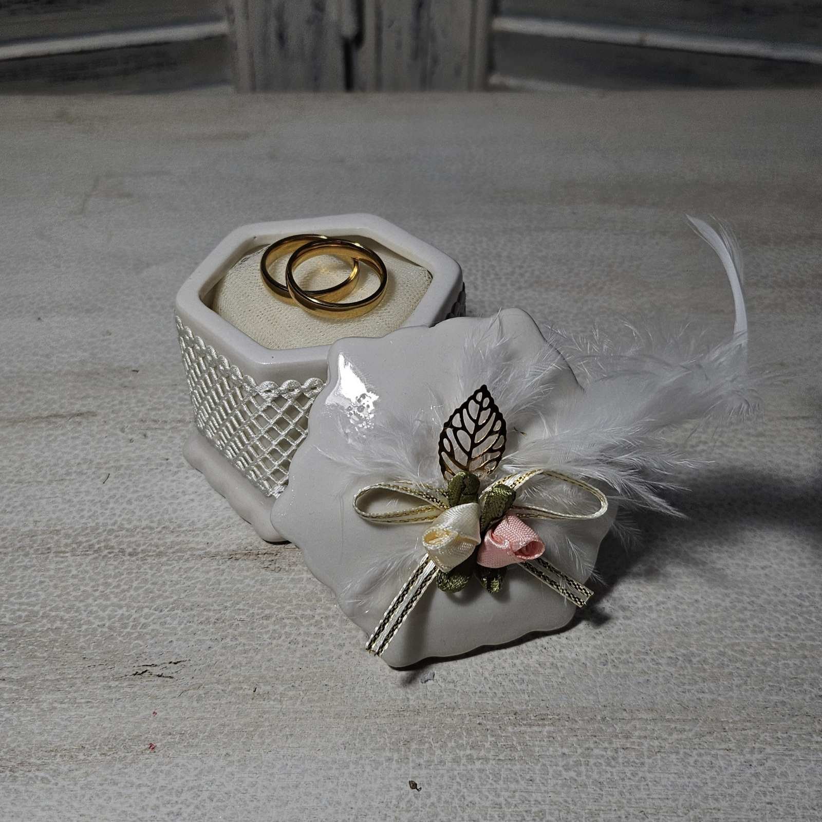 Οι λεπτομέρειες παίζουν πάντα καθοριστικό ρόλο σε κάθε γαμήλια τελετή. Η πορσελάνινη βεροθήκη με σατέν λουλουδάκια προσφέρει έναν εξαιρετικό τρόπο να παρουσιάσετε τις βέρες με κομψότητα και πρωτοτυπία. Τα λουλουδάκια από σατέν δίνουν μια απαλή υφή και ελαφριά λάμψη που συνδυάζεται αρμονικά με την καθαρότητα της λευκής ή ιβουάρ πορσελάνης.