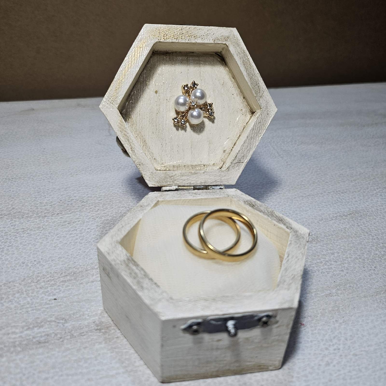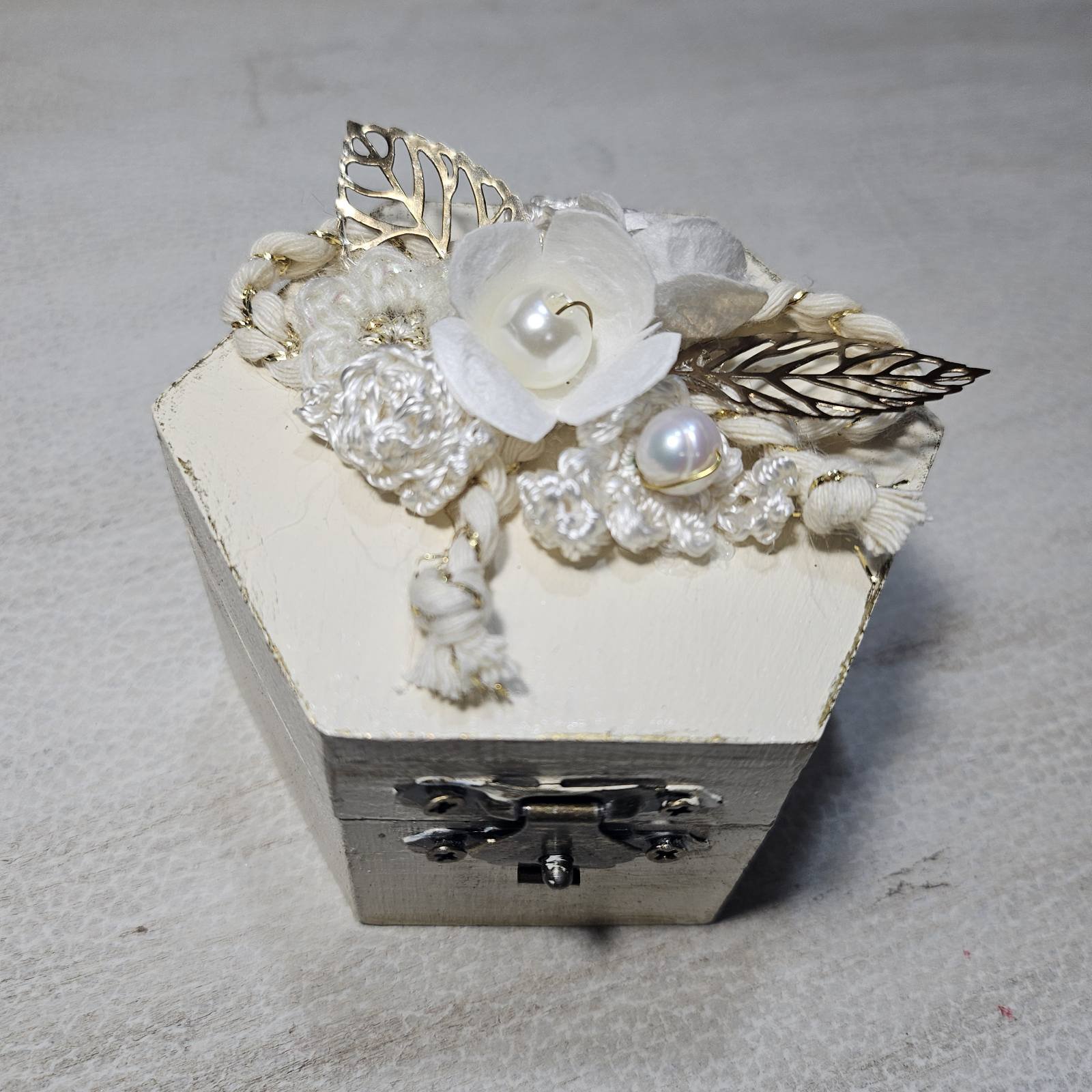 Ρομαντική ξύλινη βεροθήκη με λουλούδι από κουκούλι μεταξοσκώληκα, πλεκτές λεπτομέρειες και διακόσμηση με πέρλες και χρυσά φύλλα. Μια ξεχωριστή χειροποίητη δημιουργία που συνδυάζει παράδοση, κομψότητα και ρομαντισμό για την παρουσίαση των βερών του γάμου.