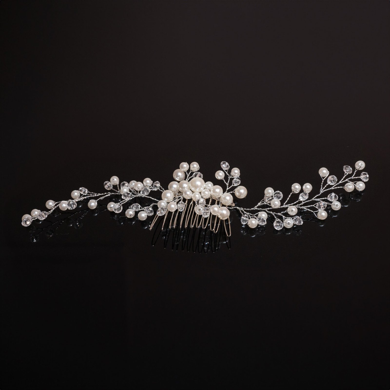 Νυφική χτένα μαλλιών με πέρλες και κρυστάλλους σε ασημί απόχρωση. Κομψό αξεσουάρ που προσθέτει ρομαντισμό και διακριτική λάμψη σε κάθε bridal χτένισμα.
