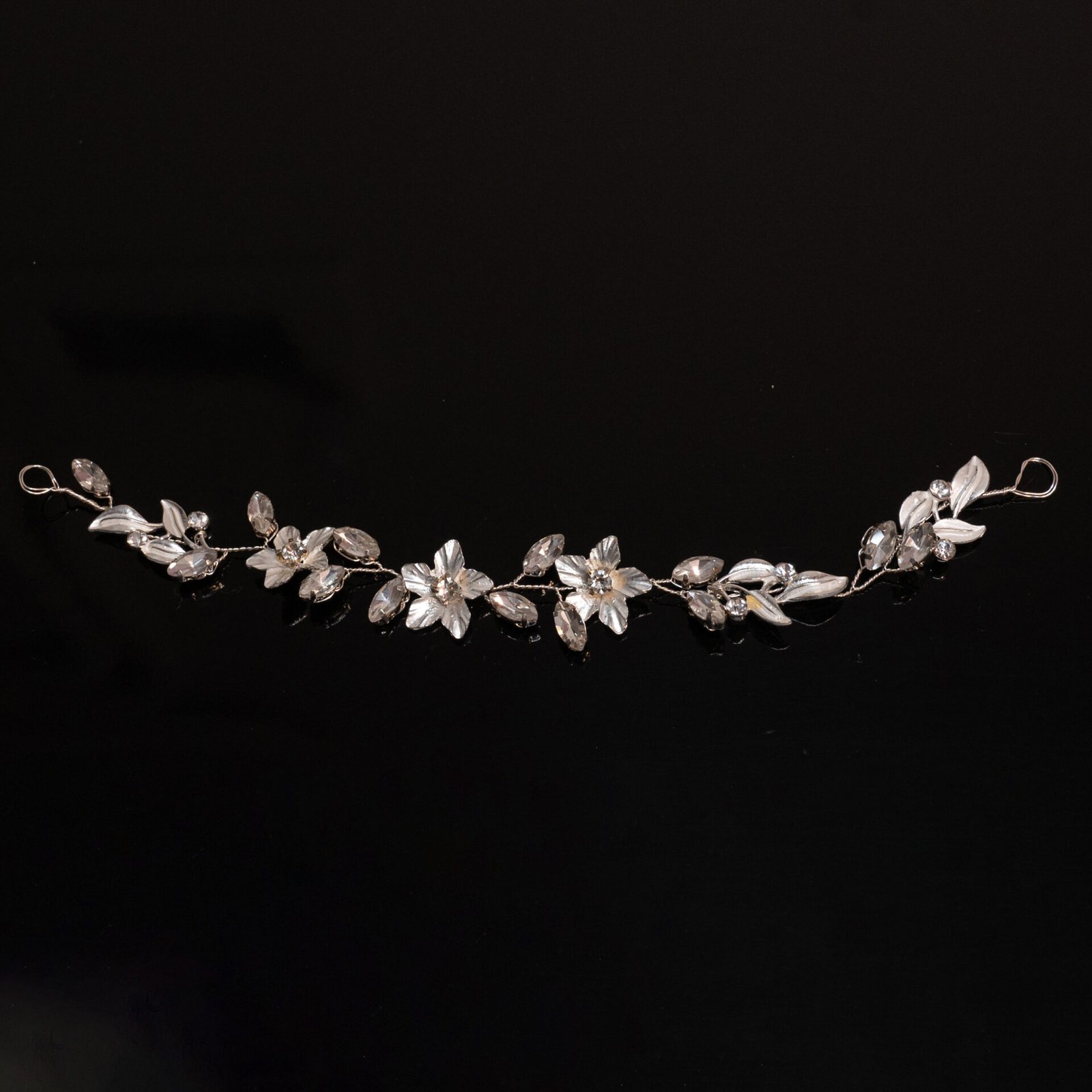 Νυφικό στεφανάκι μαλλιών σε ασημί χρώμα με λουλουδένιο σχέδιο, φύλλα και κρυστάλλους. Ένα ρομαντικό αξεσουάρ που ολοκληρώνει την bridal εμφάνιση με φινέτσα και πολυτελή λάμψη.
