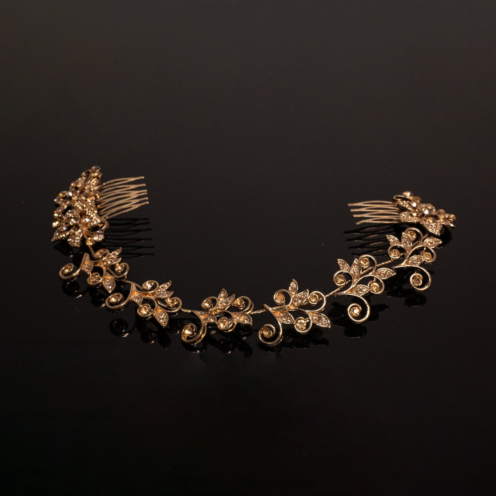 Νυφικό στεφάνι με χρυσή μεταλλική βάση και σχέδιο από φύλλα διακοσμημένα με λαμπερούς κρυστάλλους. Μια πολυτελής επιλογή που συνδυάζει ρομαντισμό και κομψότητα.