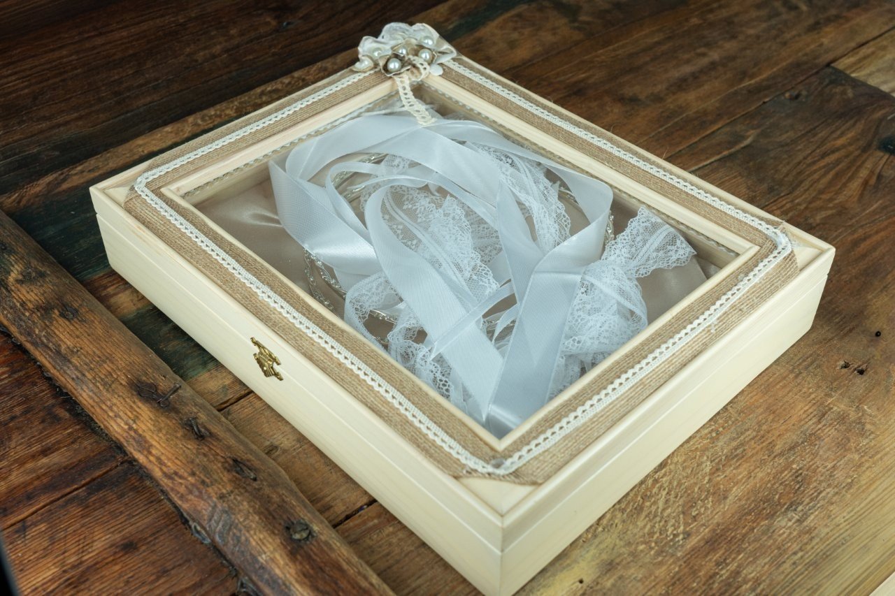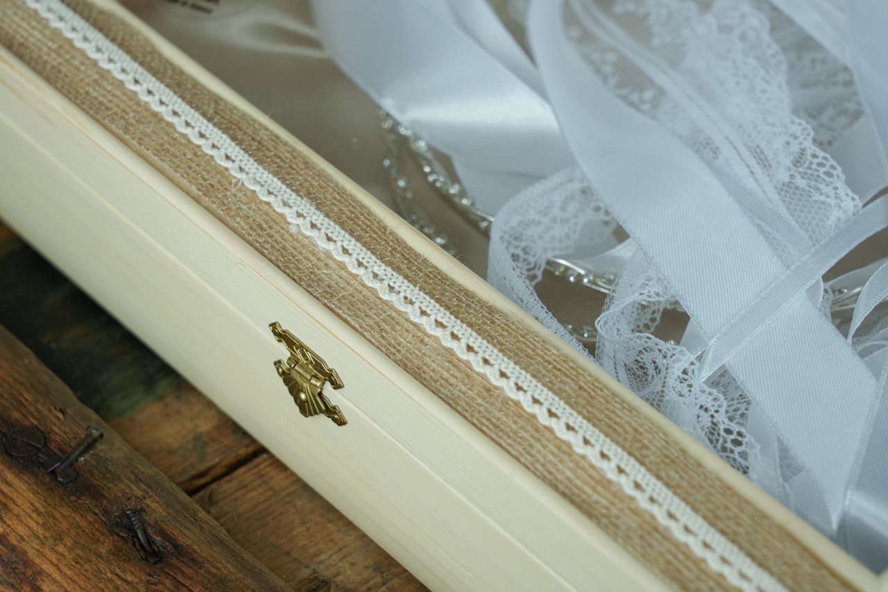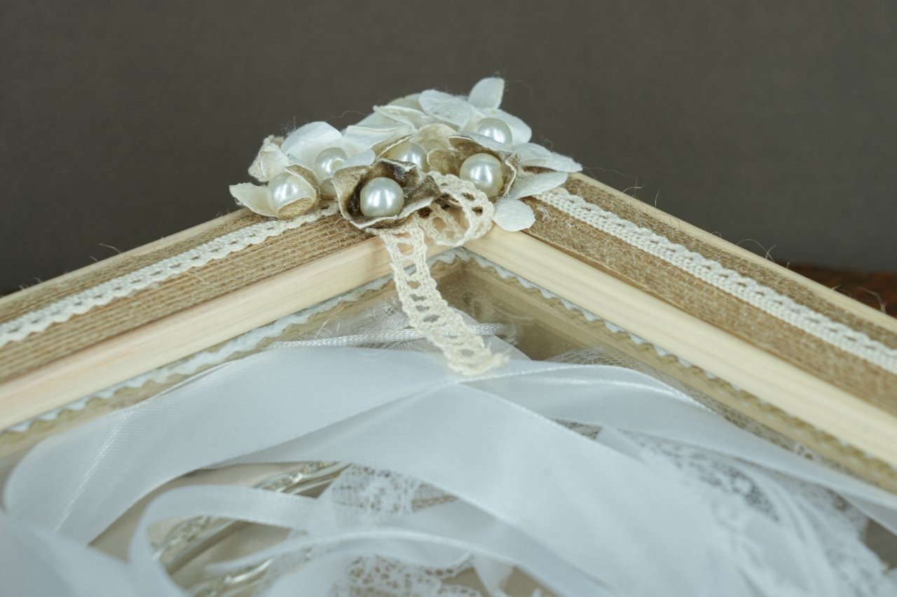 Ρομαντική στεφανοθήκη με δαντέλα, πέρλες και λουλούδια από κουκούλι μεταξοσκώληκα. Μια χειροποίητη δημιουργία που χαρίζει τρυφερότητα και διαχρονική κομψότητα στη φύλαξη των στέφανων.